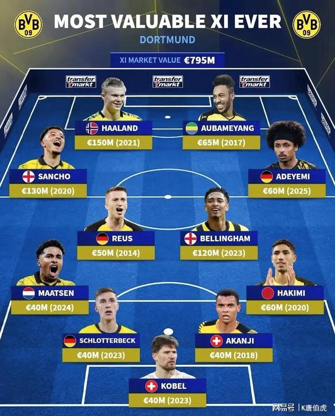最后来看一下德转最新罗列出的多特蒙德历史最贵11人阵容,总身价高达7.95亿欧元。除了上述所陈述的球员外,还包含了门将科贝尔,后卫阿什拉夫、阿坎吉、施洛特贝克、马特森;中场阿德耶米和罗伊斯。